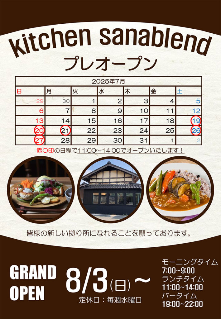 また、kitchen sanablend はバータイム(19:00〜22:00)も営業しており、京丹後の地酒やセレクトワイン、ソフトドリンクや一品料理もご用意しております。